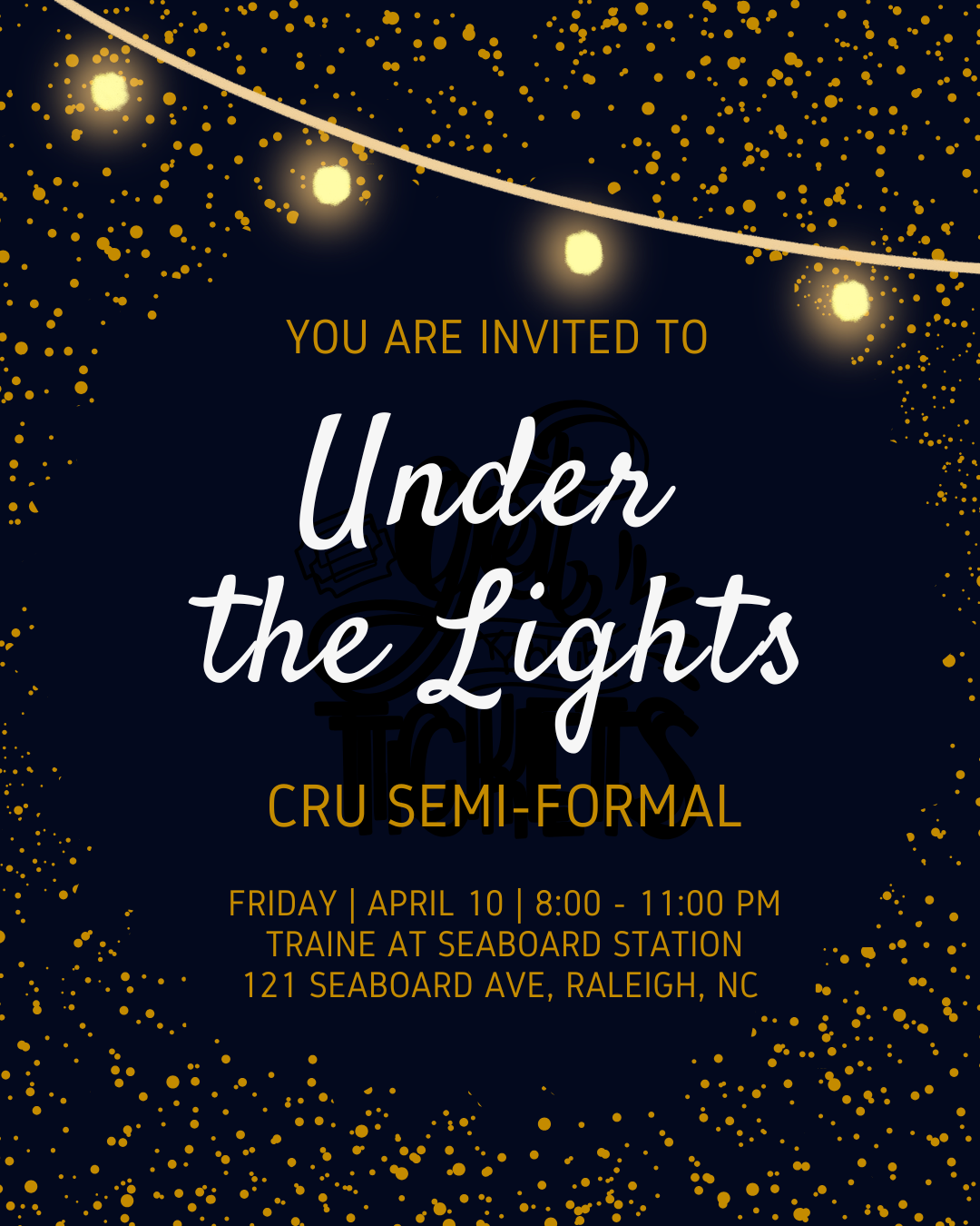 We will have our CRU Semiformal on Fri Night, April 10th from 8-11pm at a nice venue - "Traine at the Seaboard" - in downtown Raleigh. It should be great time and a great way to finish out the semester. We hope you can come !! The cost will be $22/person and you can purchase tickets online at the link below. We will email you a ticket with a QR code that we will scan at the door. We will not be able to sell tickets at the door.
